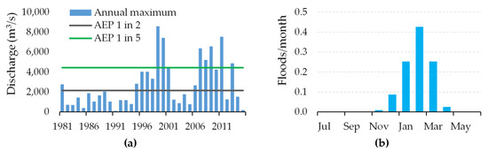 Historical floods in the Mitchell basin, (a) annual maximum discharge and (b) seasonal variation in flood frequency (AEP stands for annual exceedance probability).