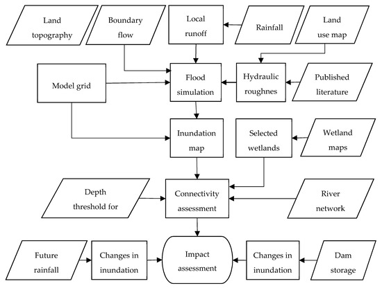 The study was conducted using a floodplain hydrodynamic model combined with GIS-based analysis. Figure 3 illustrates the methods, showing three major components from model configuration to impact assessment. The first step is the configuring, calibrating and validating the model with several sets of input data followed by analysing the wetland connectivity. The third component of the study was scenario modelling for different climate and construction of a water storage on the Mitchell River.