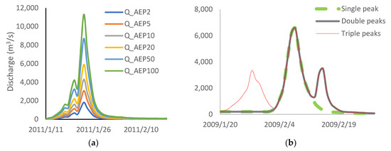 where m is the rank of flood in the data series and n is the data length in year. A flood with a recurrence interval of Tr years was presented by QT. These flood data were fitted to a Pearson Type III (LP3) distribution to estimate the exceedance probability of an individual flood. To evaluate the significance of flood magnitude on wetland connectivity, six flood events of annual exceedance probability (AEP) of 0.5 (1 in 2), 0.2 (1 in 5), 0.1 (1 in 10), 0.05 (1 in 20), 0.02 (1 in 50) and 0.01 (1 in 100) were investigated. Time series of flood hydrographs were constructed based on a 2011 flood by scale-down and scale-up the maximum discharge of the 2011 flood to match the flood magnitude obtained from flood frequency distribution. It is important to note that the duration of connectivity largely differs between flood events of similar magnitude but a different number of secondary peaks [51]. To investigate this aspect, flood events of single peak, double peak and triple peaks were used (Figure 4).