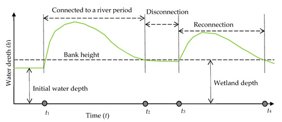 A wetland was considered connected to a river when a continuous flow path existed between the wetland and river. To identify connected waterbodies (e.g., wetlands, rivers) at each time step, an algorithm was developed in the ArcGIS environment to check contiguous grids in the entire modelling domain. For this purpose, a threshold water depth was used to distinguish connected water bodies from the rest the domain. Following consideration of the low resolution of the floodplain topographic data and the high roughness of the floodplain landscape due to vegetation cover, a threshold water depth of 10 cm was used in this study [53]. Figure 5 shows a schematic representation of identifying connection and disconnection of a wetland based on water depth. A wetland is considered connected to surrounding water bodies when it starts receiving flood water and considered disconnected when water depth falls below bank level. The wetland could be reconnected if there is any secondary flood peak (Figure 5).