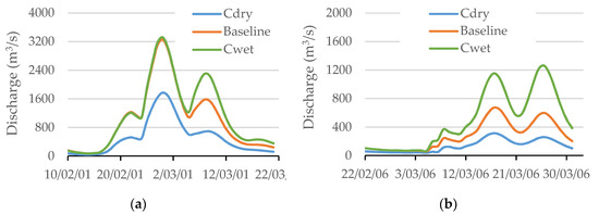 Typical flood hydrographs for climate scenario modelling for (a) 2001 (AEP of 1 in 10) and (b) 2006 (AEP of 1 in 2) events. Cdry and Cwet represent the changes in inflow to the floodplain with respect to baseline condition.
