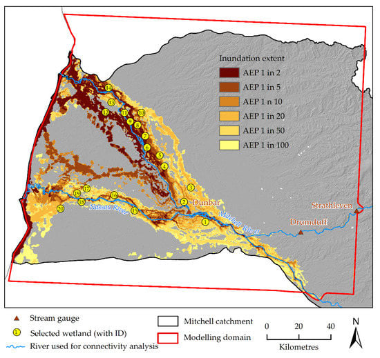 Figure 9 shows an example of connectivity analysis for the 20 selected wetlands based on inundation information for the flood event in 2009 (AEP 1 in 26). At each time step, connected and disconnected wetlands with rivers were identified and the information was accumulated to quantify the time sequence of connectivity of individual wetland. The left panel shows the connected and disconnected wetlands on 15 February 2009 (10 days since flood has started) and the right panel shows the same for 1 March 2019 (24 days since the flood has started). On the 10th day of the flood (rising flood), 9 wetlands were connected to the Mitchell and Nassau rivers and on 24th day (receding flood), 12 wetlands were connected to the river. It is important to note that some wetlands could be inundated by flood water but designated as not connected (e.g., 48 on the left panel). This is because the inundation is not continuous between the wetland and the river.