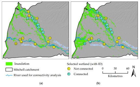 Method of connectivity analysis based on inundation information for the 2009 flood. Connected wetlands are shown for (a) 15 February 2009 and (b) 1 March 2009.
