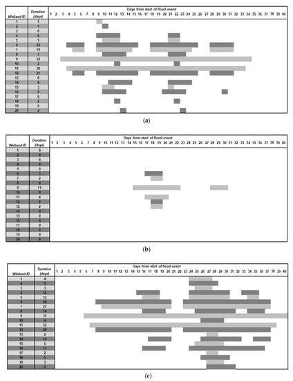 Timing and duration of connectivity of 20 selected wetlands in the Mitchell river basin for the (a) 2001 flood (AEP of 1 in 10), (b) 2006 flood (AEP of 1 in 2) and (c) 2009 flood (AEP of 1 in 26).