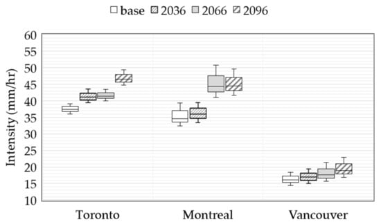 Figure 3. The mean rainfall intensity of the cities shows that the rainfall intensity of Toronto is slightly higher than that of Montreal and more than double the rainfall intensity of Vancouver. However, Vancouver has a maximum average annual rainfall of 1569 mm, about 90% higher than Toronto and 50% higher than Montreal. Overall, the trend of projected mean rainfall intensity presents an increase in the intensity of rainfall in the future for each city for each future period. However, there is an exception for Toronto in Scenario 2066, where the intensity is shown to remain almost constant compared to the previous scenario (2036). This is similar to Montreal for Scenario 2096 compared to the previous scenario (2066). Note that the variability of rainfall intensity is higher in Montreal compared to the other two cities.