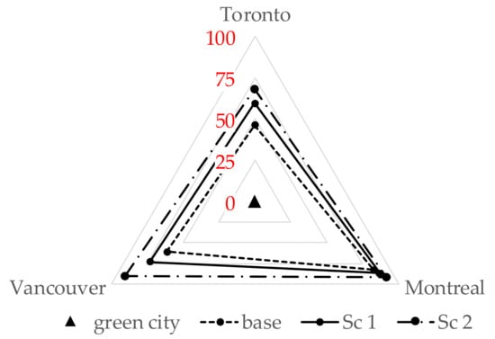 Figure 3 shows that Toronto (for the base scenario) is the closest to the “green city” and Montreal is the most urbanized city (closest to 100% impervious cover). As expected, the two projected scenarios (Sc1 and Sc2 representing medium and high urbanization) move each city further away from the “green city”.