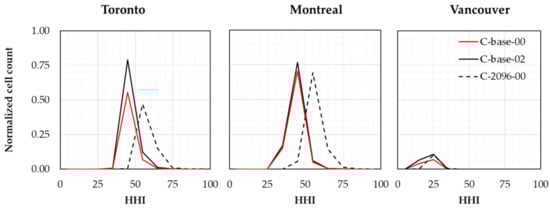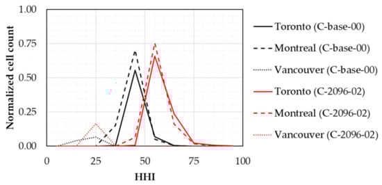 Figure 4 shows the normalized histogram of HHI for each city for the two scenarios listed above; a low HHI value represents a lower demand for LID, and a higher value represents a higher demand. Generally, there a higher demand for LID in Montreal, with a slight difference compared to Toronto, and Vancouver has the lowest demand for LID. The mean HHI values for the C-base-00 and C-2096-02 scenarios range from 46.2 to 58.2 (a 26% increase) for Toronto, from 44.0 to 56.4 (a 28.2% increase) for Montreal, and from 21.3 to 25.1 (a 17.8% increase) for Vancouver.