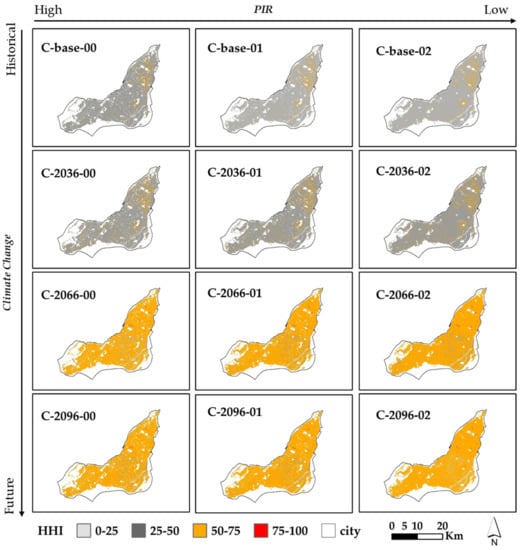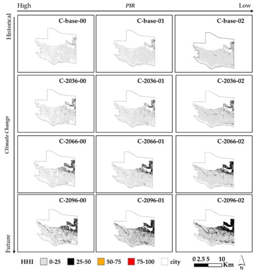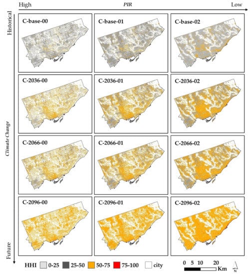 The mean HHI value for Vancouver at the base scenario is 21.3, and this increases with climate change to 25.1 (a 17.8% increase) and remains unchanged with urbanization. The mean HHI rises to 25.1 (a 17.8%) for the integrated climate change and urbanization scenarios. The AHDS for this city at the current state is 1.2 million cells (0.9% of the city area), which increases to 1.9 million cells (1.6 times higher than the C-base-00) for only climate change scenarios and to 1.9 million cells (1.6 times higher than the C-base-00) for only urbanization scenario. The integrated climate change and urbanization scenario raises AHDS to 3.1 million cells, i.e., 2.5 times higher than the AHDS of the base scenario. The near-equal values of AHDS under the climate and urbanization scenarios indicate that the effect of both factors on HHI is similar. Although the mean HHI of urbanization scenarios remained the same, the increase of frequency of HHI has increased the overall AHDS.