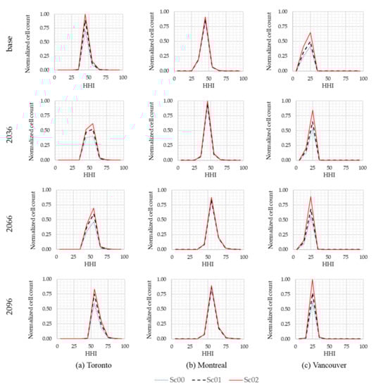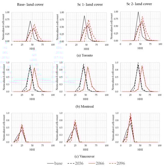 Figure 11. As concluded above, in response to the effects of climate change, Toronto and Montreal present an increase of HHI value with a shift of the histograms to the right, whereas this shift is lower in Vancouver. In terms of urbanization, it is evident that in all three cities the frequency of HHI has increased (i.e., higher peaks). As mentioned above, this increase is due to the increase in the number of cells that are generating runoff (non-zero runoff cells).