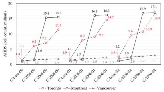 Figure 2. For Toronto, urbanization seems to have a slight effect on AHDS, e.g., starting from 1.4 million cells for C-base-00 and reaching 2.5 million cells for C-base-02. In contrast, an increase in rainfall intensity due to climate change has a significant influence on increasing AHDS, e.g., the AHDS is 11.5 million cells for C-2096-00 and rises to 16.9 million cells for C-2096-02. Montreal presents similar behavior as Toronto; the AHDS of this city also has a notable increase with time for different climate scenarios. However, Vancouver’s responses to climate change are similar to the impact of urbanization (from 1.2 million to 1.9 million cells in both cases) and are lower than in the other two cities. The reason is related to the low rainfall intensity of this city, which is a key difference between Vancouver and the other two cities.