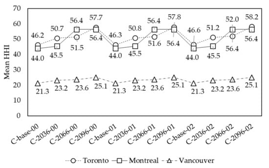 The trend of the mean HHI values for each city for all scenarios was also analyzed and is presented in