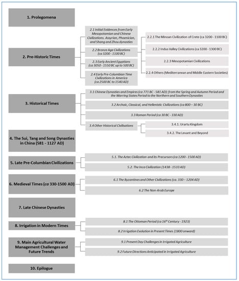 This study is organized as follows: (a) Section 1 is an introductory one; (b) Section 2 and Section 3 refer to the irrigation in pre-historic and historical times; (c) Section 4 refers to early Chinese dynasties; (d) Section 5 refers to late pre-Columbian civilizations; (e) Section 6 refers to medieval times; (g) Section 7 refers to late Chinese dynasties; (f) Section 8 refers to modern times; (h) Section 9 discusses the main agricultural water management challenges and future trends; and (i) Section 10 includes the epilogue and the concluding remarks.