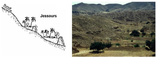 Jessours in southern Tunisia for growing tree crops (adapted from [39]; photo of A. Bahri).
