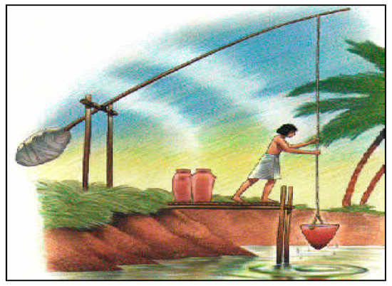 The Egyptian “shaduf” (Figure 5) and the water wheel, or “noria” or “sania” are probably among the earliest devices for lifting water from the Nile River for irrigation and domestic uses [12]. A modified version of the shaduf, called locally Diou or Dlou, was developed in North Africa and the Arabian Peninsula at the beginning of the ca 12th century BC [45]. It was refined later on with the introduction of a pulley and animal traction for lifting water from deep wells.