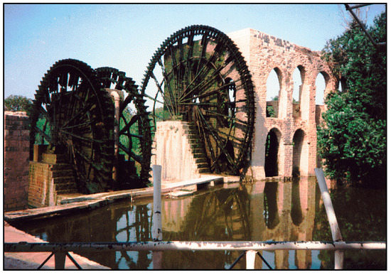 A different version of the noria is the Persian Wheel (Figure 6), whose date of invention is not well known. It consists of an endless series of pots of unequal weight turned over two pulleys [48], and it is therefore classified as a pump rather than a water wheel. This device, in its different versions, represents the ancestor of water pumps and modern hydropower systems. The system used for lifting water to irrigate the Hanging Gardens of Babylon remains a mystery, although Greek historians describe it as consisting of something similar to an Archimedes’ screw or chain pumps, each consisting of two large wheels powered by slaves.