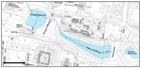The natural water reservoirs were expanded, lined with plaster, and maintained with a system of plants and microbial flora that kept stored water potable throughout the dry season [54]. At its height, Tikal was home to as many as 100,000 inhabitants, whose needs for drinking and irrigation water were met by a system of ten reservoirs, at least four of which laid within the central precinct of the city. The reservoirs of Tikal stored runoff from rainfall that was flowing over the plastered ground, channeled into a series of reservoirs that fed first the elite residences, then those of lower-status families and finally ran towards agricultural fields in the outskirts of the city. Though the construction of Tikal’s reservoirs (Figure 8) began in the Late Preclassic period, the construction program was greatly expanded in the Classic period to meet the needs of a rapidly growing urban population [52,55]. Later, despite Tikal being abandoned for nearly a millennium, the reservoirs continue storing and regulating water throughout the year.
