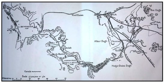 - Money, R.I. The irrigation of the Konia Plain. Geogr. J. 1919, 5, 298–303. [Google Scholar] [CrossRef]