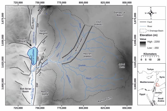 The eastward continuation of the Golan Heights is the flat and southward dipping volcanic area of the Hauran Plateau, which passes in the SE into the enormous accumulation of Neogene-Quaternary basalts of the Jebel Druze [,]. Precipitation infiltrates directly into Upper Quaternary basalts exposed all over the Plateau and drains towards the LYG, partially feeding perennial springs in the arcuated Wadi Arram (Figure 1) which was a major contributor to the Yarmouk River in the past [].
