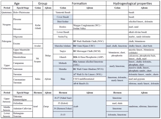Stratigraphic table comparing the Israeli and Jordanian nomenclature. Aquiferous units are colored in blue after [].