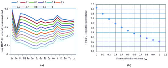 Variation of rare earth element distribution patterns in mixtures of basaltic-rock and limestone water. (a) Estimates of mixing of basaltic-rock-(1) and limestone water (0); (b) resulting C1 chondrite normalized Tb/Lu values as a function of εbw. REY data are taken from [] and are normalized to C1 chondrite to get smooth curves. The average of Ein Dan and Ein Banyas in Mount Hermon Massif are used as pure limestone water; as basaltic-rock water the analysis of Mukheibeh 2/2013 is used. Data are taken from [].
