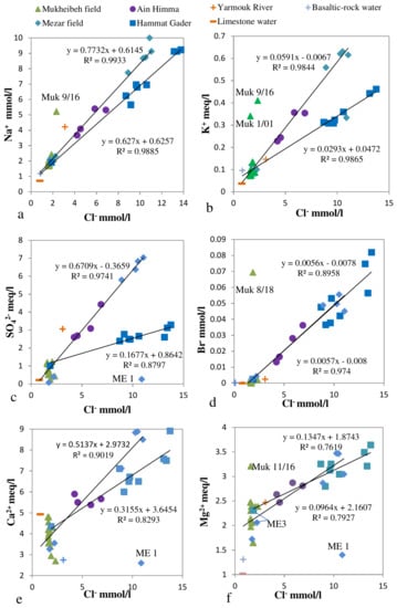 Basaltic rock and limestone waters with lowest Cl− concentrations are suggested as end members because enhanced Cl− concentrations suggest dissolution of halite from evaporites and/or leaching of seawater brines enclosed in limestones. The lowest Cl− concentrations of basaltic-rock water from the Golan and Hauran Plateau were 0.84 meq/L (Table 1 and Table A1).