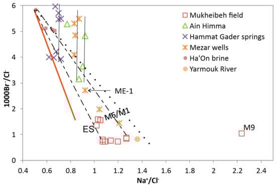 More details are revealed by the trend lines in the cross plots of 1000 × Br−/Cl− and Na+/Cl− in Figure 6. For orientation, the trend of evaporated seawater is given as a red line [,]. The groundwater from springs of Hammat Gader and Himma and from well Mezar 2 define vertical trends, which are only explainable by leaching of Br− from the organic-rich limestones of the B3 aquitard. Mezar 1 and 3 and the low Br−/Cl− samples of all vertical trends suggest a mixing line between Mukheibeh groundwater and evaporated seawater such as the Ha’On brine []. A second mixing line is indicated by Ein (Hebrew term for spring) Sahina (ES) and the wells Mukheibeh 1 and 6. The water of Mukheibeh 9 well shows an extreme position.