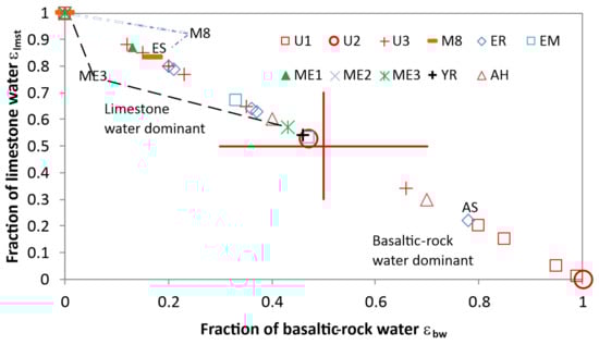 The cross plots of and show the distributions of the various types of water mixtures along the diagonal line (Figure 7). The red cross marks the arrays of either dominantly limestone or basaltic rock groundwater. The pure limestone water is presented by Mezar 2 and Mukheibeh 8 in the year 2013; the most basaltic-rock groundwater is among the Mukheibeh ones. Hammat Gader, Ain Himma and Mezar 3 cover the range of between zero and 0.5. Most of the Mukheibeh waters (U1 and U2) are of the basaltic-water type, whereas the Mukheibeh subgroup U3 (with one exception) and the remaining groundwaters are of limestone water type.