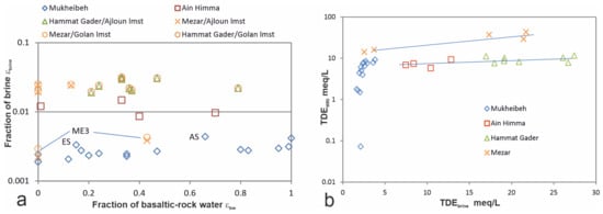 Following the two suggested approaches of salinization in Section 3.2, two results are obtained depending on the origin of Cl− either from leaching of only evaporites or from leaching of evaporites (WRI) and brines. Both ways of estimations are documented in Table A2 and summarized in Table 3. The second approach yields the sum of TDEbrine and TDEWRI and a maximum for TDEbrine (Table A2), whereas yields TDEWRI+brine in Table 3. TDEWRI increases over two orders of magnitude in Mukheibeh groundwater. Contrastingly, the increase of TDEWRI in each of Mezar, Ain Himma and Hammat Gader is less than a factor of two (Figure 8b). The contributions of TDE from water/rock interactions (TDEWRI) are less those by brine (TDEbrine) in Hammat Gader, Mezar and most of the Ain Himma samples.