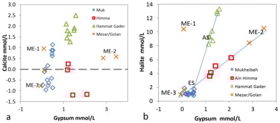 The cross plots of calcite and gypsum reveal that their amounts are very similar and independent on the absence or presence of brine Equation (2). Gypsum is always dissolved, but calcite is both dissolved in Hammat Gader, Mezar and part of the Muhheibeh waters, and precipitated in the other part of Mukheibeh and Himma water (Figure 9a). The cross plots of halite and gypsum dissolution only reveal two trends between Mukheibeh at one end and either Hammat Gader waters or Mezar and Himma waters at the other end (Figure 9b).