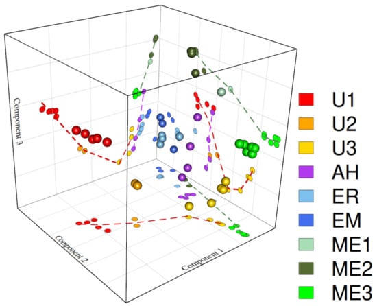 The results of the k-medoid clustering are visualized in terms of principal coordinates in the three-dimensional plot of Figure 10. Hereby a classical multidimensional scaling (otherwise known as principal coordinates analysis [,]) was performed on the dissimilarity matrix already computed by the clustering algorithm described above. These three first coordinates cumulatively explain 83% of the variance of the samples of Table 1. The spheres represent the positions of samples in the vectorial space of the principal coordinates; the similarly colored small dots indicate the corresponding projections on the three faces of the cube. In the C1/C2 plane Mukheibeh waters (code U1, U2, U3 in Table 1) yield a curve which is far away from the projection of Hammat Gader samples (codes ER and EM). ME2 waters show some relationship to ME1. The projections onto C1/C2 and C1/C3 planes reveal that ME3 waters are closely associated with code U3 in plane C1/C2. Only in the plane C2/C3 are ME3 and U3 well separated. Ain Himma is well separated from Hammat Gader and Mukheibeh (U1-U3) in the C1/C2 plane.