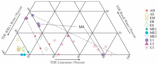 The triplot visualizes the differences of the various local groundwaters and brines (Figure 11). The contributions TDEWRI+brine, TDEbw and TDElmst in groundwaters show a narrow cluster of Mezar wells 1 and 2, Hammat Gader and Ain Saraya samples, whereas water from Mukheibeh well field, Ain Himma and Mezar 3 covers a wide field between the dashed lines. The contributions in TDE from brine and WRI are between 10% and 70%; contributions are 80% and 90% in Mukheibeh, Ain Himma and Mezar 3 and Hammat Gader and Mezar wells 1 and 2. These estimates do not really differ, if the sources of limestones water or brines are varied.