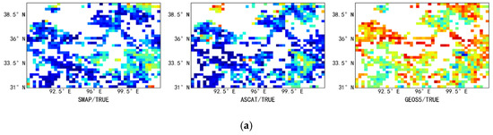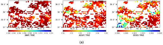 Due to the presence of snow cover in winter, satellite-derived soil moisture data are not available in the study area for this season (the data is blank), and the soil moisture data from each dataset from the period of 1 April to 30 November of 2017 and 2018 were extracted. Subsequently, due to the difference in spatial resolution between the different soil moisture datasets adopted in this study, the passive data (SMAP, SMOS, FY3B, FY3C, and AMSR2) were interpolated using bilinear interpolation, and the active data (ASCAT) was interpolated to the resolution of the reanalysis data (GEOS5) using an inverse distance weighted interpolation. The units of all of the soil moisture data used in this study are volume water content (m3/m3 or %) and unit conversion was therefore unnecessary. Furthermore, although the active and passive satellite remote sensing soil moisture data used in this study have slightly different observation depths, the depths of both are on the order of centimeters beneath the soil surface, so we calculate it directly and less impact on the final TC result. In order to ensure the accuracy of the TC results, the regions with correlation coefficients less than 0.2 for the passive products, active products, and reanalysis data were masked and not used for the TC calculation. It is worth noting that the raster data calculated using the TC method show that the correlation coefficients among the three groups of data are all greater than 0.2 and pass the significance test for correlation coefficients (a = 0.05).