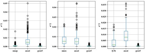 Figure 6 shows the spatial distribution of fMSE in the study area. From the figure, it can be seen that the fMSE data obtained by TC in [SMOS, ASCAT, GEOS5] are largely limited to the northeastern and southwestern corners of the study area and that the noise in the soil moisture data obtained from the SMOS passive data is significantly larger than that obtained using the ASCAT passive dataset. The spatial distribution of the fMSE for the four other passive data products are similar to each other, in that higher fMSE values are mostly observed in areas with extremely low vegetation coverage in the northeastern region and in areas with high vegetation coverage in the southeastern region, while lower fMSE values are observed in the southwestern region, which has moderate vegetation coverage. The spatial distribution of fMSE obtained using the active product (ASCAT) is similar to that obtained using the passive product, however larger fMSE values are more scattered than for the passive product. This can be explained by the fact that observation signals are significantly more noisy in the active product than in the passive products, which results in the more scattered distribution of fMSE in the active product. Additionally, it can be seen from Figure 7 that the fMSE for the GEOS5 reanalysis data is significantly larger than that for the active and passive data products (i.e., the noise is stronger), and that the median fMSEs for the SMAP, FY3B, FY3C, and AMSR2 data, respectively, are almost the same as the median fMSE for the ASCAT data.