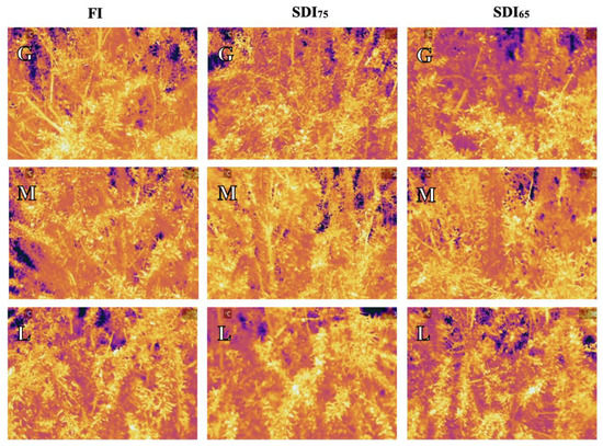 Thermal images at the sunny side of the studied almond canopies. FI, fully irrigated treatment; SDI75, sustained deficit irrigation treatment at 75% of the irrigation requirements; SDI65, sustained deficit irrigation treatment at 65% of the irrigation requirements; G, Guara; M, Marta; L, Lauranne.
