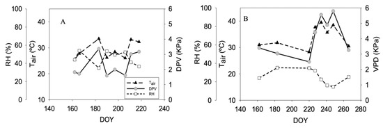 Meteorological conditions during the data collection in 2018 (A) and 2019 (B). Tair, air temperature; RH, relative humidity; VPD, vapor pressure deficit; DOY, day of the year.