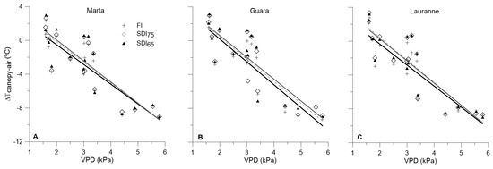 Water-stress baselines for cvs. Marta (A), Guara (B), and Lauranne (C). Black continuous, discontinuous and grey lines are the regressions functions that represent the non-water-stress baseline for fully irrigated (FI), and the water-stress baselines for sustained deficit irrigation at 75% of the crop irrigation requirements (SDI75) and sustained deficit irrigation at 65% of the crop irrigation requirements (SDI65), respectively.