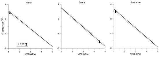 Taking as reference the Tair values registered during the data acquisition (Figure 2), the ΔTcanopy-air was calculated, and afterwards, the relationships with measured VPD were defined for each treatment and cultivar, considering the whole dataset obtained in both experimental seasons (Figure 3, Table 5).