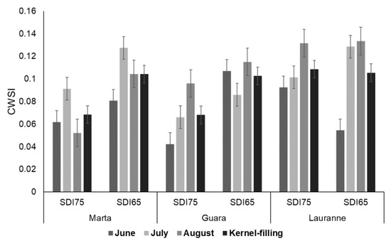 Finally, taking into consideration the NWSB and WSB for each treatment and cultivar, and with the aim of establishing a useful threshold limit that ensures the maximum water savings, the CWSI on a monthly basis was estimated (Figure 5). It is noticeable the progressive increase along the kernel-filling period, especially in cvs. Marta and Lauranne, displaying a progressive rise because of the water-stress accumulation. Moreover, in cv. Guara and cv. Marta, the SDI65 reported a CWSI higher than those obtained in cv. Lauranne, where in the latter the SDI75 registered similar values of the CWSI. For cv. Guara, the maximum CWSI was reached under SDI65, with values close to 0.14. Similar results were found for cv. Lauranne (~0.15), whereas in cv. Marta these values were somewhat lower, roughly 0.12.