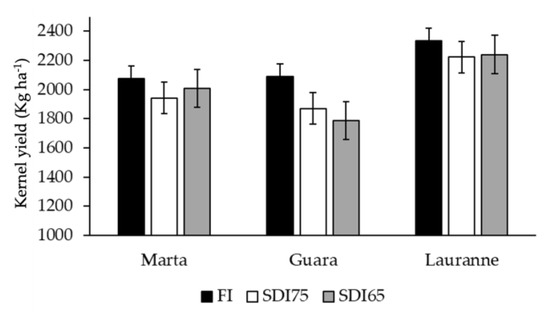 Average kernel yield for the studied almond cultivars during the study. FI, fully irrigated at 100% of irrigation requirements; SDI75, irrigated at 75% of the irrigation requirements; SDI65, irrigated at 65% of the irrigation requirements. Vertical bars are standard deviation.