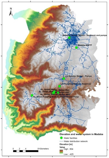 The total length of the existing distribution network is 1000 km from the wells to the customers’ meters, with an average pressure of 0,6 MPa. Water is pumped from an altitude of 330 m a.s.l. to elevations of 750–800 m a.s.l., which requires huge amounts of energy. As shown in Figure 1, the Madaba governorate is supplied by 15 wells in Heedan and Wala, which are pumped via the pumping stations in Walah and Libb to the main reservoir in Madaba (6000 m3) via a nominal diameter (DN 600) branch line off the main transmission line (DN 800) from Libb to Muntazah (Amman). The total production from the Heedan well field in 2018 was 10.5 million m3 []. The customers of Madaba Directorate are either supplied by the Madaba Reservoir via gravity supply (35%) or by direct pumping (65%) from the Madaba Pumping Station. The existing distribution pipework in Madaba itself is 433 km in length plus an additional 187 km for the rest of the directorate, with pipe sizes ranging from DN 50 up to DN 600 [,].