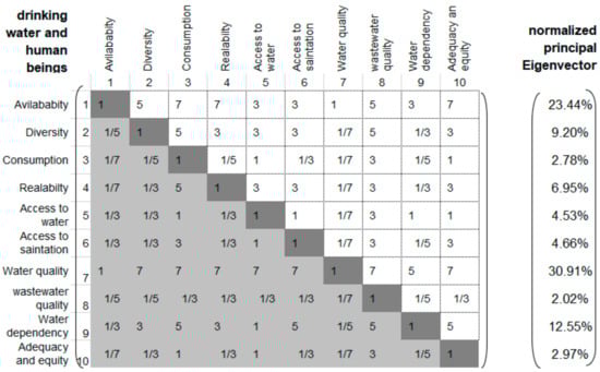 Matrix of drinking water and human well-being, = 11.288, CR = 9.6%.