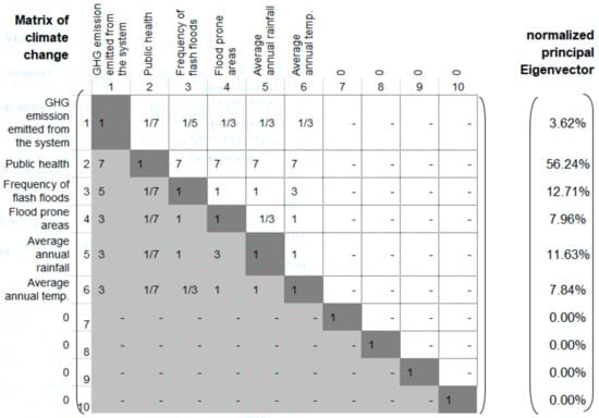 Then problem turns into a general process for calculating the largest eigenvalue corresponding to the eigenvector to assess the Consistency Index (CI), where A is the matrix, x is the eigenvector, and λ is the eigenvalue. When we divide the CI by the random consistency number, the final value of consistency ratio (CR) is recommended to be less than 0.10 to be consistent, and if it is more than 0.10, the matrix should be adjusted by reassessing the relative importance []: