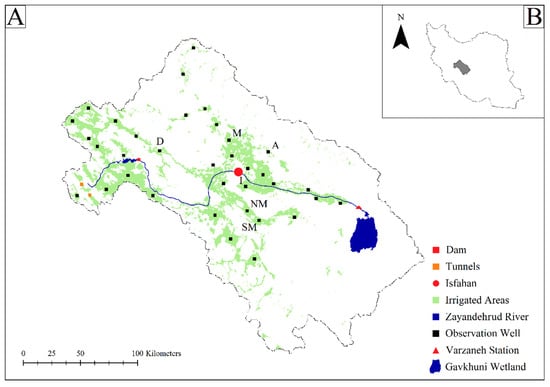(A) Zayanderud River Basin with layout of the irrigated areas, groundwater aquifers observation wells, tunnels, Varzaneh station and the location of the Gavkhuni Wetland. (B) The location of the Zayanderud Basin in Iran. The figure also shows the position of observation wells with the highest depletion rate: NM: North Mahyar, SM: South Mahyar, D: Damaneh, I: Isfahan, M: Murchehkhort and A: Ardestan.