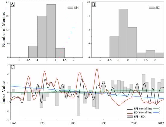 The hydrological drought index (SDI) uses standardized annual streamflow volumes to define values lower than the mean streamflow by at least one standard deviation value. Based on SDI values, the state of hydrological droughts is defined, which is close to that of SPI (Table 2). Nalbantis and Tsakiris [] suggested that the SDI can be calculated using the following: