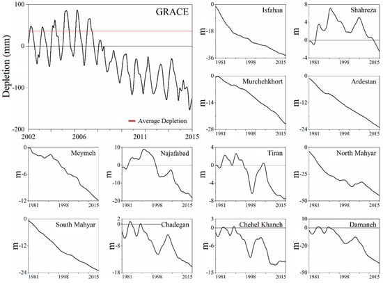 The water mass depletion in the Zayanderud Basin based on data derived from the gravity recovery and climate experiment (GRACE) mission. Figure 3 also shows the groundwater depletion rate in meters in the 12 biggest aquifers in the Basin. Y Axis: GRACE depletion in (mm), groundwater depletion level in (m).