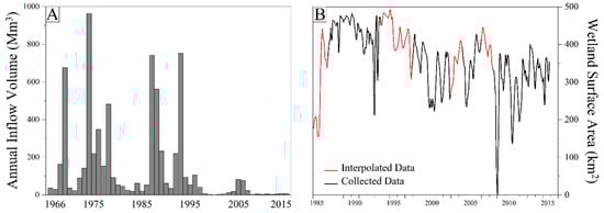 Wetland Gavkhuni. (A): The annual inflow volume to the Gavkhuni Wetland, in (Mm3) for 1966–2015. (B): the wetland area fluctuation (km2) for 1985–2015, missing or uninterpretable were interpolated and are shown in red in (B).