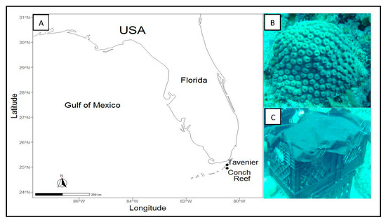 (A) Coral were collected from Conch Reef within the Florida Keys National Marine Sanctuary (FKNMS) located near Tavenier (Lat: 24.96, Long: −80.45) Florida, USA. (B) Colonies of Montastraea cavernosa were collected and placed in (C) black crates covered with shade cloth to help reduce stress experienced during collection.