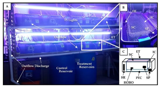 (A) Experimental tank design. (B) Treatment tank design. (C) Schematic of treatment tanks. Control Reservoir = control tank water, ET = experiment tank, HE = heating element, HOBO = temperature and light meter, IC = incubation chamber, Outflow = IC water drainage, Outflow discharge = discharged water, PEC = plastic egg crate, SC shade cloth, SP = submersible pump, T5 lights = 54 watt lights.