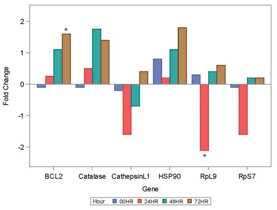 Acute heat exposure showing gene abundance (B-cell lymphoma 2 apoptosis regulator (BCL-2), Catalase, CathepsingL1, heat shock protein 90 (HSP90), Ribosomal protein L9 (RpL9), and ribosomal protein S7 (RpS7)) expressed over a 72-h period. Data expressed as ‘fold change’ defined as the concentration difference between the control and the particular gene being examined. Star “*” denotes statistically significant (p ≤ 0.05) data.