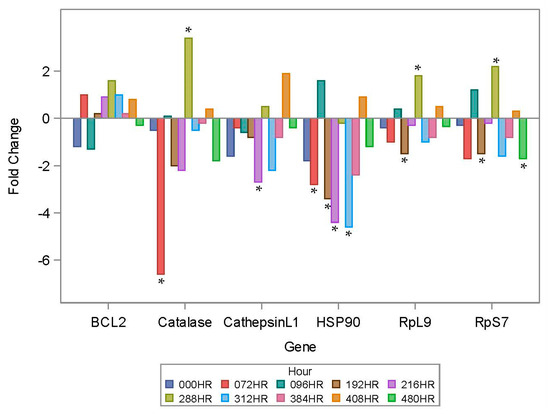 Chronic heat exposure showing gene abundance (B-cell lymphoma 2 apoptosis regulator (BCL-2), Catalase, CathepsingL1, heat shock protein 90 (HSP90), Ribosomal protein L9 (RpL9), and ribosomal protein S7 (RpS7)) expressed over 480 h. Data expressed as ‘fold change’ defined as the concentration difference between the control and the particular gene being examined. Star “*” = statistically significant (p ≤ 0.05) data.